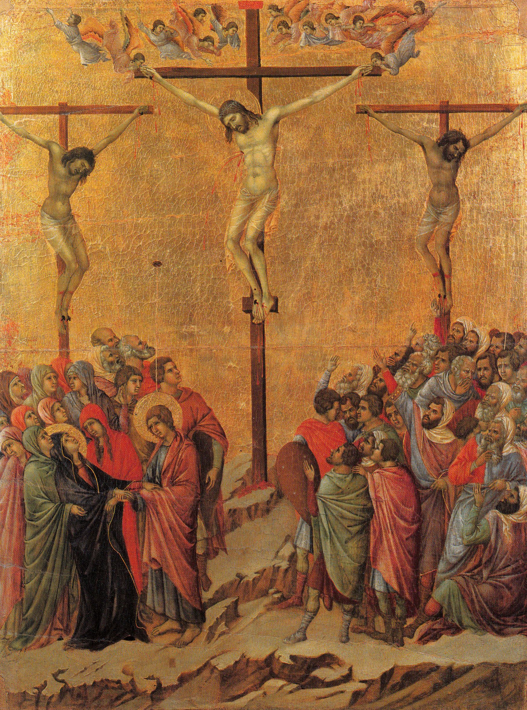 Duccio nickt. Auch darüber hat er sich schon oft Gedanken gemacht. Er sagt: „Goldgrund und natürliche Umgebung, das passt vielleicht auf den ersten Blick nicht genau zueinander. Aber eigentlich gehört es doch zusammen. Auch die Gesichter auf der Vorderseite der Tafel können erzählen, und umgekehrt findet sich in den Erzählbildern der Rückseite viel zu nachdenklicher Betrachtung, indem wir mit den Worten der Evangelisten durch die Bilder wandern, sie in ein lebendiges Geschehen verwandeln“. Er erntet bei seinen Besuchern aufmerksames Nicken: „Wenn ich an das Ereignis denke, wie der Auferstandene der Maria von Magdala begegnet“, spinnt einer den Gesprächsfaden weiter, „wie hier ein Garten erscheint, mit einem Baum voller Früchte, da spüre ich die Lebendigkeit des neuen Lebens, und in dem golddurchwirkten Gewand des Auferstandenen das Geheimnis seines Lebens bei Gott und unsichtbar unter uns Menschen“. Ein anderer zeigt auf das große Mittelbild mit dem gekreuzigten Jesus und sagt: „Dieses Bild erzählt uns zwar das grausame Geschehen und strahlt zugleich so viel Ruhe aus. Zu den schlimmen Ereignissen passt eigentlich kein Goldgrund, und doch leuchtet hier schon in dem Gold österlicher Glanz auf“. Nachdenklich sagt einer: „Andachtsbild und Erzählbild zugleich, das könnte die Zukunft der Malerei sein“.